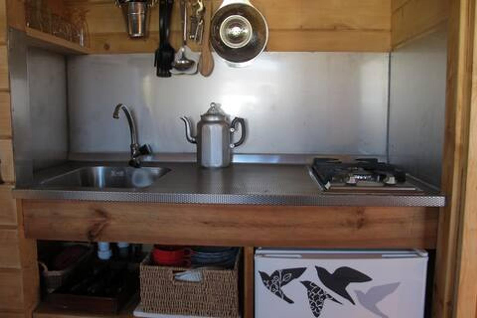 Voor toilet en douche maakt u gebruik van het gemeenschappelijke sanitairgebouw van de camping, dat zich vlak achter de blokhut bevindt. Zo combineert u het charmegevoel van een blokhut met het gemak van goede campingfaciliteiten.