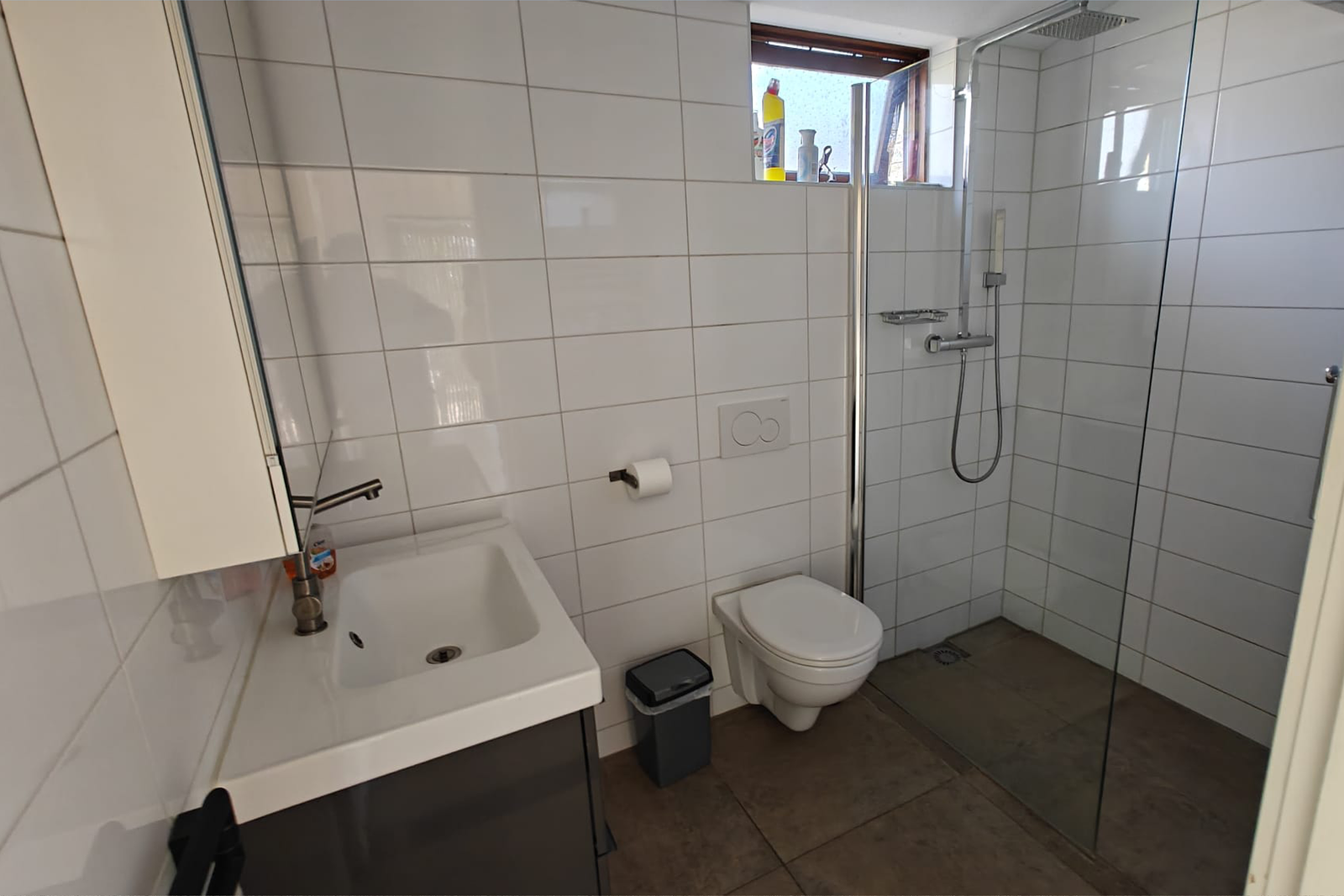 De moderne badkamer is stijlvol afgewerkt en voorzien van een ruime inloopdouche, toilet en wastafel. Een frisse, comfortabele ruimte waar u de dag ontspannen begint of afsluit.
