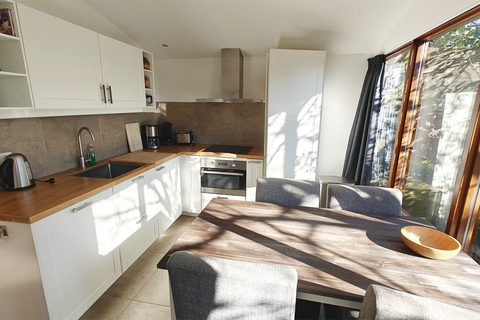De open keuken is volledig ingericht en voorzien van moderne apparatuur, waaronder een afwasmachine, inductiekookplaat en combimagnetron met heteluchtoven. Of u nu uitgebreid wilt koken of snel iets bereidt na een dag buiten, alles is aanwezig voor een zorgeloze vakantie.