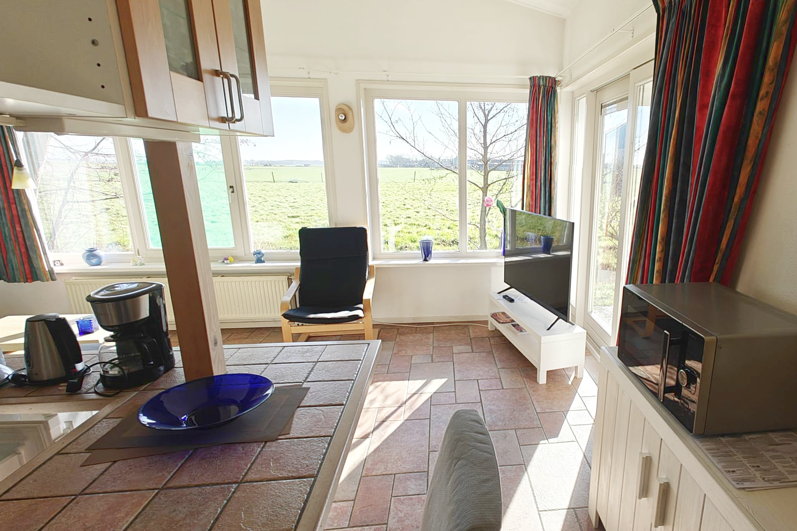 De lichte woonkamer met grote raampartijen biedt prachtig uitzicht over de omliggende landerijen. Hier ervaart u direct het vrije gevoel van de kust.